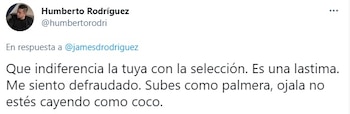 En Twitter, usuarios como Humberto Rodríguez manifestaron: “Que indiferencia la tuya con la selección. Es una lastima. Me siento defraudado. Subes como palmera, ojala no estés cayendo como coco”.