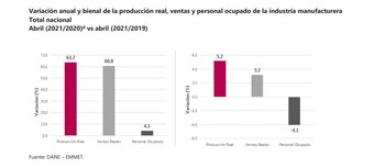 En ese sentido, el DANE señaló que en dicho mes, la variación anual de las ventas reales del comercio minorista y de vehículos fue del 75,0 %; en la industria manufacturera, la producción y las ventas reales presentaron variaciones anuales de 63,7 % y 60,8 %, respectivamente; y en servicios, los ingresos nominales de otros servicios de entretenimiento y otros servicios se incrementaron 205,2 % mientras que los de la producción cinematográfica y de televisión lo hicieron en 156,0%.