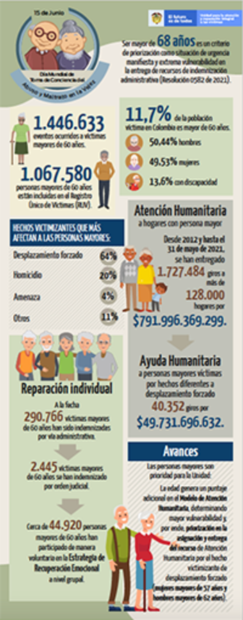El Día Mundial de la Toma de Conciencia Contra el Abuso y el Maltrato en la Vejez, la Unidad para las Víctimas confirmó que en el Registro Único de Víctimas (RUV), a la fecha se han incluido 1.446.633 eventos ocurridos a víctimas que, actualmente, son mayores de 60 años. Al realizar una distribución porcentual de los cuatro hechos victimizantes con mayor ocurrencia, y con corte al 31 de mayo de 2021, vemos que el desplazamiento forzado (64%) encabeza la lista, seguido por homicidio (20%), amenazas (4%) y otros (11%).