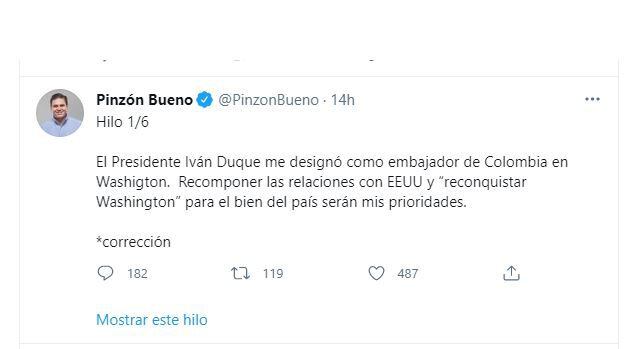 Tras el nombramiento oficial de Juan Carlos Pinzón Bueno como nuevo embajador de Colombia en los Estados Unidos, el excandidato vicepresidencial de Germán Vargas (contrincante de Iván Duque en las elecciones de 2018) publicó un hilo de Twitter donde reveló las tareas que el primer mandatario le encomendó en su nuevo puesto, entre ellas: “recuperar Washington”.