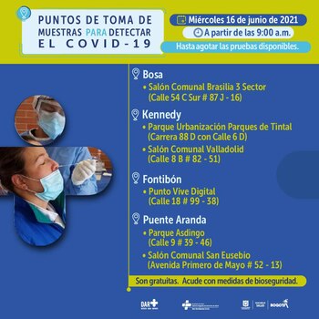 La capital colombiana continúa con las jornadas de toma de pruebas gratuitas de covid-19. Le contamos cuáles son los puntos habilitados por las cuatro Subredes del Distrito en las diferentes localidades, para este miércoles 14 de junio.