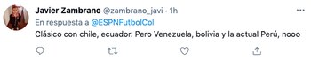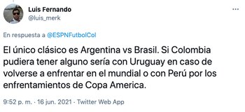 “El único clásico es Argentina vs Brasil. Si Colombia pudiera tener alguno sería con Uruguay en caso de volverse a enfrentar en el mundial o con Perú por los enfrentamientos de Copa America”, “Clásico con chile, ecuador. Pero Venezuela, bolivia y la actual Perú, nooo” y “cuál es el afán de buscar un clásico, COLOMBIA no tiene clásicos”, fueron algunas de las reacciones.