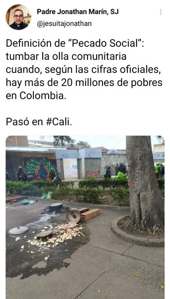La discusión comenzó porque el jesuita compartió una imagen por Twitter donde se observa una olla de comida comunitaria en el suelo y al fondo uniformados de la policía. El hecho aparentemente es registrado en la ciudad de Cali y ocurrió como respuesta de los uniformados a los manifestantes, por lo que Marín comentó: “Definición de “pecado social”: tumbar la olla comunitaria cuando, según las cifras oficiales, hay más de 20 millones de pobres en Colombia”.