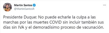 Petro, sin embargo, no fue el único que reparó en las afirmaciones de Duque. También lo hizo Martín, el hijo del expresidente y premio nobel de Paz Juan Manuel Santos . “Presidente Duque: No puede echarle la culpa a las marchas por las muertes COVID sin incluir también sus días sin IVA y el demoradísimo proceso de vacunación”, trinó.