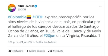 “CIDH expresa preocupación por los altos niveles de la violencia en el país, en particular por el hallazgo de los cuerpos descuartizados de Santiago Ochoa de 23 años, en Tuluá, Valle del Cauca, y de Kevin García de 16 años, el #20jun en La Virginia, Risaralda”, escribió la organización internacional.