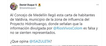 La misiva la publicó el concejal de Medellín Daniel Duque, quien cuestionó a ese movimiento. “Al Concejo de Medellín llegó esta carta de habitantes de Valdivia, municipio de la zona de influencia del Proyecto HidroItuango, donde señalan que la información divulgada por Ríos Vivos es falsa y no se sienten representados. ¿Que opina Isabel Zuleta?”, escribió el concejal.