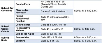 A continuación encontrará los puntos de vacunación, la dirección y los horarios de atención que se están manejando de lunes a viernes: