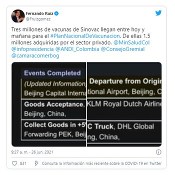 “Tres millones de vacunas de Sinovac llegan entre hoy y mañana para el Plan Nacional de Vacunación. De ellas 1.5 millones adquiridas por el sector privado”, comunicó el funcionario en la red social.