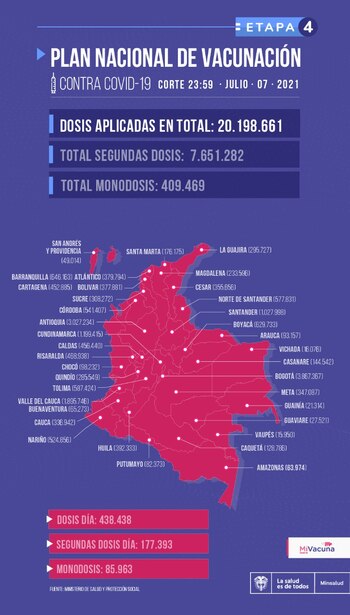 El más reciente reporte del Ministerio de Salud también señala que, hasta las 11:59 p.m. del 7 de julio ya se habían aplicado en Colombia un total de 20.198.661 dosis de la vacuna contra el covid-19.