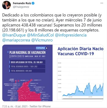 Según informó el ministro de Salud, Fernando Ruiz Gómez, con esa cifra el país superó los 20 millones de dosis aplicadas y los 8 millones de esquemas completos, que avanzan hacia la meta de llegar a 25 millones de dosis para el final del mes, que propuso el presidente Iván Duque.
