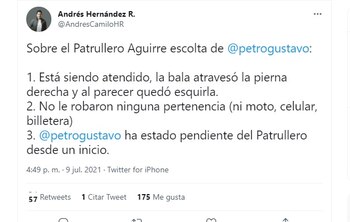 Por su parte, el jefe de prensa de Petro, Andrés Hernández, aseguró en su cuenta de Twitter que la bala atravesó la pierna derecha al patrullero y al parecer quedó esquirla, y que además no le robaron ninguna pertenencia (ni moto, celular, billetera).