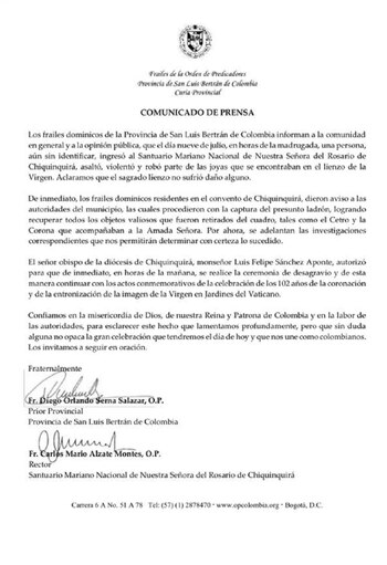 El hecho se conoció mediante un comunicado emitido por los frailes dominicos de la Provincia de San Luis Bertrán, quienes aseguraron que un individuo ingresó al Santuario Mariano Nacional, donde se encuentra la estatua de Nuestra Señora del Rosario de Chiquinquirá y “violentó y robó parte de las joyas que se encontraban en el lienzo de la Virgen” de ese municipio boyacense.