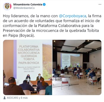 Con el objetivo de crear una plataforma colaborativa que preservará la microcuenca de la quebrada Toibita ubicada en Paipa, Boyacá se firmó un acuerdo de voluntades entre el Ministerio de Ambiente y Desarrollo Sostenible y la Corporación Autónoma Regional de Boyacá (Corpoboyacá), además de la Gobernación de Boyacá, la Alcaldía de Paipa, la Empresa de Servicios Públicos Red Vital S.A. E.S.P. y otras entidades.