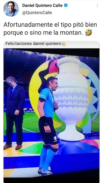 Pero como en todos los encuentros, los memes no pudieron faltar, entre esos se viralizó uno en el que señalaban el sorprendente parecido entre el juez central y el alcalde de Medellín Daniel Quintero. Al mandatario le preció tan gracioso que compartió uno de los memes que tenía un mensaje que decía “Felicitaciones Daniel Quintero” junto con una foto de perfil de Claus recibiendo el reconocimiento por pitar en el campeonato.