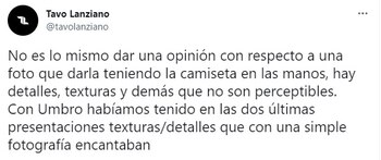 “No es lo mismo dar una opinión con respecto a una foto que darla teniendo la camiseta en las manos. Hay detalles, texturas y demás que no son perceptibles. Con Umbro habíamos tenido en las dos últimas presentaciones texturas/detalles que con una simple fotografía encantaban”, sostuvo el usuario Tavo Lanciano, manifestando que es necesario observar la indumentaria personalmente para poder dar un veredicto.