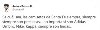 También hubo usuarios como Andrés Botero, quien resaltó que más allá de la marca de la indumentaria, si es del equipo de sus amores es hermosa. “Se cuál sea, las camisetas de Santa Fe siempre, siempre, siempre son preciosas... no importa si son Adidas, Umbro, Nike, Kappa, siempre son lindas...”, trinó.