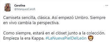 Otros seguidores del conjunto cardenal, como Carolina Márquez opinaron que Umbro también comenzó con diseños sencillos, pero que luego fue de menos a más: “Camiseta sencilla, clásica. Así empezó Umbro. Siempre en vivo cambia la perspectiva. Como siempre, estará en el clóset junto a la colección. Empieza la era Kappa”.
