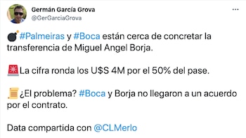 De otra parte, según lo adelantaron a través de su cuenta de Twitter los periodistas, Germán García Grova y César Luis Merlo, Boca se comunicó con Palmeiras, dueño de los derechos deportivos, y envió una oferta de cuatro millones de dólares por el 50 % del pase.