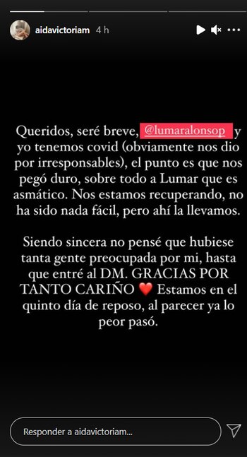 “Queridos, seré breve, @lumaralonsop y yo tenemos covid (obviamente nos dio por irresponsables), el punto es que nos pegó duro, sobre todo a Lumar que es asmático. Nos estamos recuperando, no ha sido nada fácil, pero ahí la llevamos”, escribió Merlano en una de sus historias de Instagram, red social donde cuenta con más de 2,1 millones de seguidores.