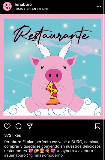 Recientemente, la Feria Buró en su Instagram publicó una foto para aparentemente calmar las tensiones e invitar a más personas a conocer el evento de emprendedores ubicado en el Gimnasio Moderno, al norte de la capital colombiana. En la foto aparece un cerdo sosteniendo un pedazo de pizza, alimento central de la polémica.