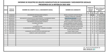 La Registraduría Nacional publicó este jueves el listado de los once precandidatos a la Presidencia de Colombia que eligieron la recolección de firmas ciudadanas para respaldar sus campañas en las elecciones del próximo año.