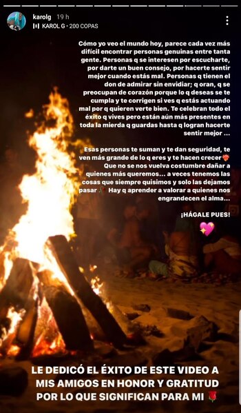 El mensaje se volvió viral por la profundidad del mismo, y porque después publicó, en la misma sección de historias, el famoso momento donde fue captada ‘cantando con sentimiento’ diciendo que ese debió ser el original de ’200 copas’. Además, escribió en su cuenta de Twitter : “estoy lista para cantar 200 copas con 200 copas encima”.