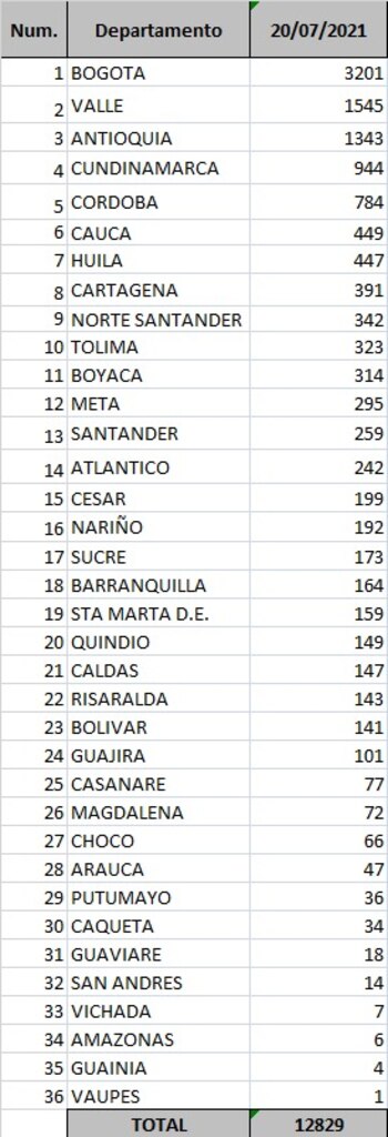 El Ministerio de Salud y Protección Social reportó, este martes 20 de julio, 12.829 casos nuevos de covid-19 en Colombia. En las últimas 24 horas se procesaron 88.787 pruebas de las cuales 54.817 son PCR y 33.970 de antígenos.