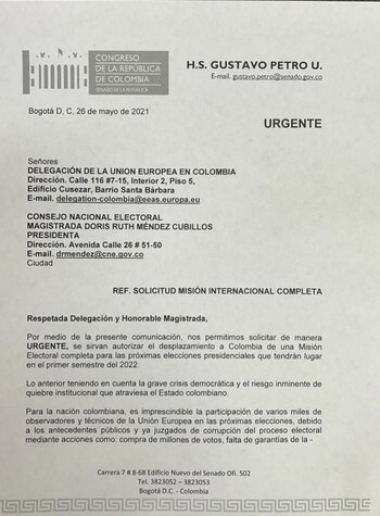 El 21 de mayo de este año el senador Gustavo Petro envió una solicitud a la delegación de la Unión Europea en Colombia con copia al Consejo Nacional Electoral pidiendo a ese organismo una misión de observación para las elecciones de 2022.