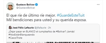 El senador respondió rápidamente a esta publicación asegurando: “El que ríe de último ríe mejor. #GuardeEsteTuit Mil bendiciones para usted y su querida esposa”.
