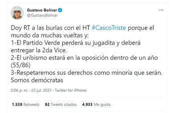 Bolívar también se refirió al #CascoTriste que utilizan los uribistas para burlarse de él en Twitter. “Doy RT a las burlas con el HT #CascoTriste porque el mundo da muchas vueltas y: 1. El Partido Verde perderá su jugadita y deberá entregar la 2da Vice. 2. El uribismo estará en la oposición dentro de un año (55/86) 3. Respetaremos sus derechos como minoría que serán. Somos demócratas”, señaló.
