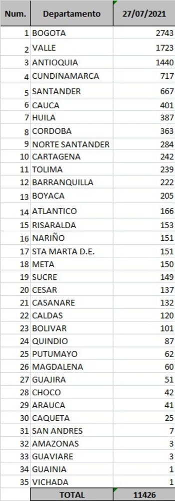 El Ministerio de Salud y Protección Social reportó, este martes 27 de julio, 11.426 casos nuevos de covid-19 en Colombia. En las últimas 24 horas se procesaron 80.253 pruebas de las cuales 42.335 son PCR y 37.918 de antígenos.