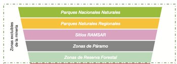 El 52 % de toda la Evoa en tierra se encuentra en las zonas excluibles de la minería, es decir, protegidas ambientalmente, las cuales corresponden a territorios de protección y desarrollo de recursos naturales renovables y ambientales donde la ley determina que no se podrán ejecutar obras de exploración o explotación de recursos minerales. Entre estas zonas, las más afectadas corresponden a espacios de reserva forestal.