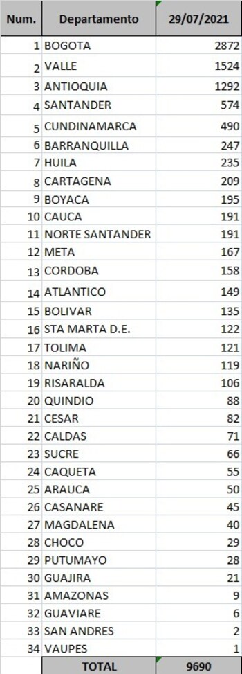El Ministerio de Salud y Protección Social reportó, este jueves 29 de julio, 9.690 casos nuevos de covid-19 en Colombia. En las últimas 24 horas se procesaron 89.569 pruebas de las cuales 38.652 son PCR y 50.917 de antígenos.
