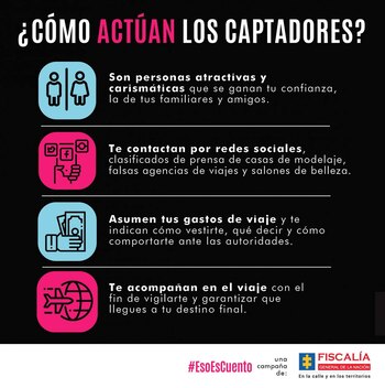 Por su parte, la Fiscalía General de la Nación ha implementado la campaña #EsoEsCuento: Si usted conoce o es víctima de este delito denúncielo marcando desde su celular a la Línea 122 o la línea nacional gratuita 018000522020.