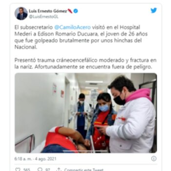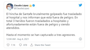 De la misma forma, la alcaldesa fue una de las primeras en confirmar el estado de salud del joven bogotano. López se refirió a Ducuara en horas de la madrugada y aseguró que los otros dos heridos que sacaron del estadio hacia los centros médicos también se encontraban fuera de peligro. Agregó que ya habían sido capturados tres agresores.