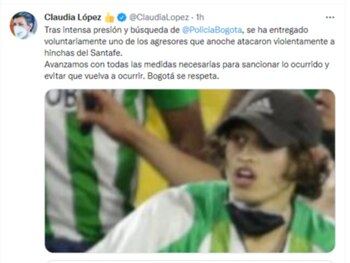 Pero en las últimas horas de este jueves, la alcaldesa Claudia López también informó que “tras intensa presión y búsqueda de Policía Bogota, se ha entregado voluntariamente uno de los agresores que anoche atacaron violentamente a hinchas del Santafe”.