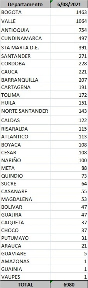 El Ministerio de Salud y Protección Social reportó, este viernes 6 de agosto, 6.980 casos nuevos de covid-19 en Colombia. En las últimas 24 horas se procesaron 78.620 pruebas de las cuales 35.526 son PCR y 43.094 de antígenos.