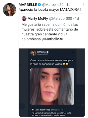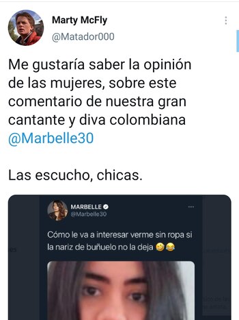 Tras el comentario de la cantante, entra el caricaturista Matador en escena, cuestionando en su perfil la opinión de las mujeres frente al ataque de la artista a la abogada. “Me gustaría saber la opinión de las mujeres sobre este comentario de nuestra gran cantante y diva colombiana Marbelle”, trinó.