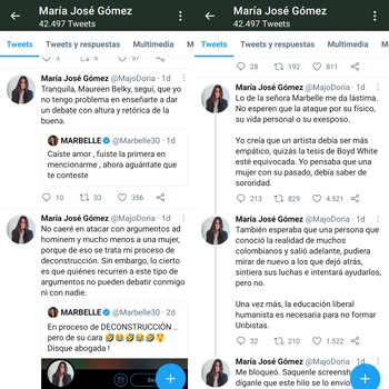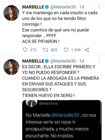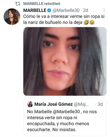 En seguida, Marbelle siguió con sus ataques a la activista y desbloqueó a la mujer de la red social, “No me mande razones nariz de buñuelo mamerta fea!”. Luego en otro trino señaló que “no me interesa lo que nariz de buñuelo hable de mi. A la larga la pobre abogadita tiene que recurrir a su términos rebuscados en latín”.