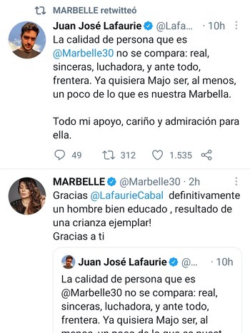 En medio de toda esta polémica Marbelle recibió el apoyo de Juan José Lafaurie, hijo de la senadora uribista María Fernanda Cabal, quien señaló que “la calidad de persona que es Marbelle no se compara; real, sincera, luchadora y ante todo frentera. Ya quisiera Majo ser, al menos, un poco de lo que es nuetra Marbella”.