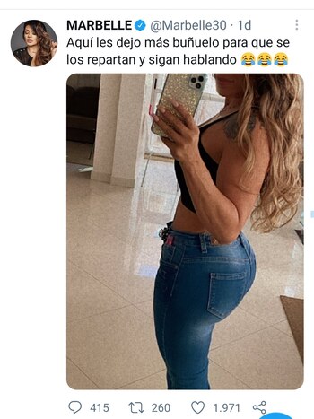 “Y me mantengo en cada insulto a cada uno de los que no ha tenido filtro conmigo. Este cuentico de que uno no puede responder... ACÁ SE PIFIARON”, escribió Marbelle y continuó burlándose del tema del buñuelo publicando una foto actual de ella.