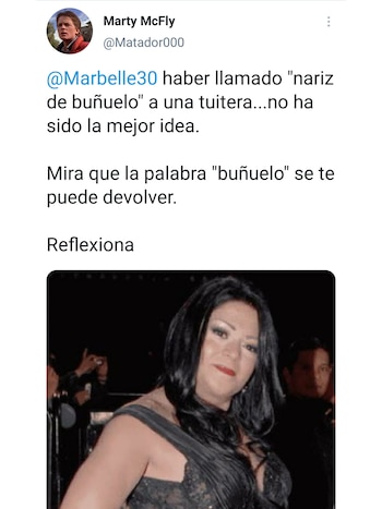 Pero el caricaturista, en un intento por seguir justificando que la cantante había faltado al respeto a la abogada, cayó en el mismo ataque. Matador publicó: “Marbelle, haber llamado ‘nariz de buñuelo’ a una tuitera no ha sido la mejor idea. Mira que la palabra ‘buñuelo’ se te puede devolver. Reflexiona” y seguido a esto agregó una imagen vieja de la artista de la tecnocarrilera.