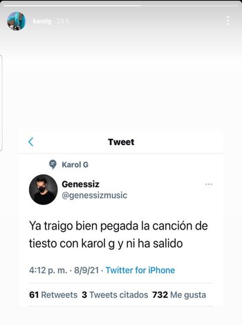 Además, en las últimas horas la ‘paisa’ compartió en su cuenta de Instagram una captura de pantalla de un trino donde la mencionan a ella y a una colaboración que hará con el DJ Tiësto.