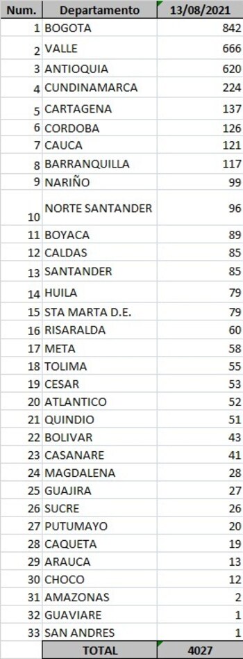 En cuanto a las regiones con más casos reportados, Bogotá lidera con 842 contagiados, seguido de Valle con 666 y en tercer lugar Antioquia con 620.