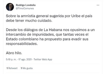 A través de su cuenta de Twitter, el excombatiente dijo que hay que tener mucho cuidado con esa propuesta. “Desde los diálogos de La Habana nos opusimos a un intercambio de impunidades, que tantas veces el Estado colombiano ha propuesto para evadir sus responsabilidades”, comentó.