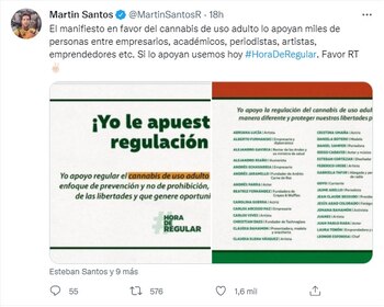 Además, horas antes, su hijo Martín Santos, también se manifestó a favor de la regulación del cannabis de uso adulto por medio de la misma red social, donde escribió: “El manifiesto en favor del cannabis de uso adulto lo apoyan miles de personas entre empresarios, académicos, periodistas, artistas, emprendedores etc. Si lo apoyan usemos hoy #HoraDeRegular.”