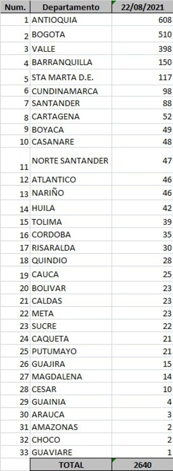 El más reciente reporte del Ministerio de Salud también señala que, hasta las 11:59 p. m. del 21 de agosto ya se habían aplicado en Colombia un total de 33.255.471 dosis de la vacuna contra el covid-19.