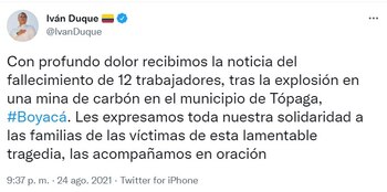 El presidente Iván Duque lamentó la tragedia después del balance final. “Con profundo dolor recibimos la noticia del fallecimiento de 12 trabajadores, tras la explosión en una mina de carbón en el municipio de Tópaga, Boyacá. Les expresamos toda nuestra solidaridad a las familias de las víctimas de esta lamentable tragedia, las acompañamos en oración”, señaló el mandatario.