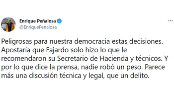 Estos comentarios se unen a los que otras personalidades trinaron hace semanas cuando se conoció la noticia. Por su parte, el exalcalde de Bogotá, Enrique Peñalosa indicó en su red social que esta determinación por parte de la Fiscalía es una peligrosa decisión para la democracia, con miras a las elecciones del 2022. “Apostaría que Fajardo solo hizo lo que le recomendaron su Secretario de Hacienda y técnicos. Y por lo que dice la prensa, nadie robó un peso. Parece más una discusión técnica y legal, que un delito”, manifestó el exmandatario capitalino.