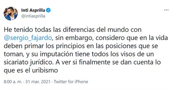“He tenido todas las diferencias del mundo con Sergio Fajardo, sin embargo, considero que en la vida deben primar los principios en las posiciones que se toman, y su imputación tiene todos los visos de un sicariato jurídico. A ver si finalmente se dan cuenta lo que es el uribismo”, manifestó Asprilla en Twitter.
